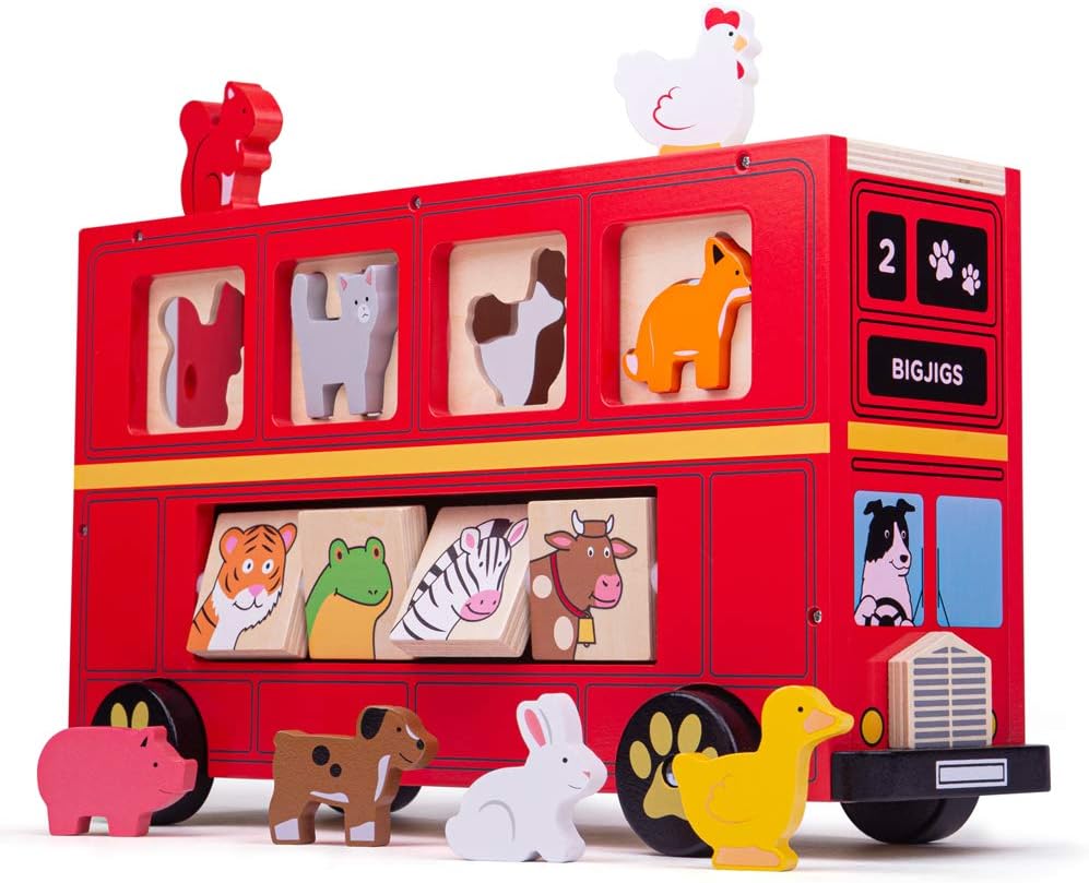 Beautifully crafted, brightly coloured wooden red bus sorter ideal for aiding child development.
