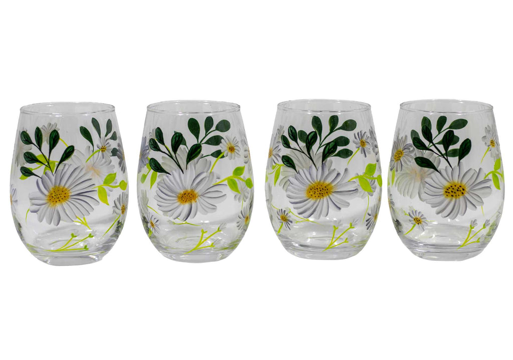 Hand-painted white daisies with green accents bring cheerful garden charm to this stemless wine glass. Each piece is uniquely decorated, making it a thoughtful gift or personal treat. Perfect for wine, cocktails, or everyday beverages.