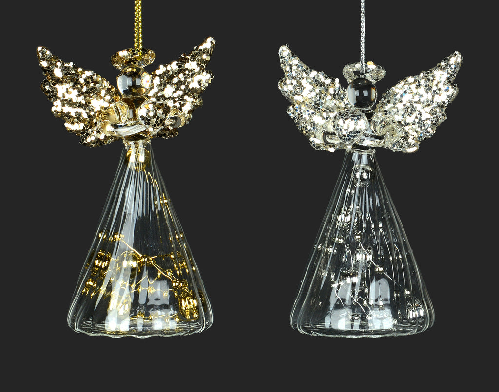 This elegant 3.5-inch tall glass angel is available in your choice of silver or gold finish. Its delicate bead accents enhance the refined craftsmanship, making it a distinguished decorative piece or heartfelt gift. Perfect for adding a touch of grace to any space or collection.