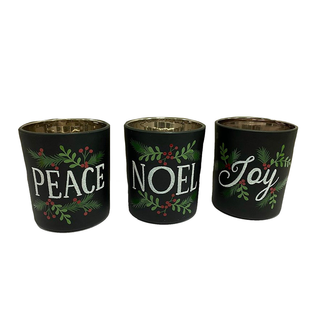 Elevate your holiday décor with this matte black glass candle holder, featuring a subtle textured finish for a refined touch. Choose from three elegant sentiments—Noel, Joy, or Peace—to perfectly complement your festive ambiance. Designed to enhance the warm glow of candlelight, this piece adds a sophisticated and meaningful accent to any seasonal setting.