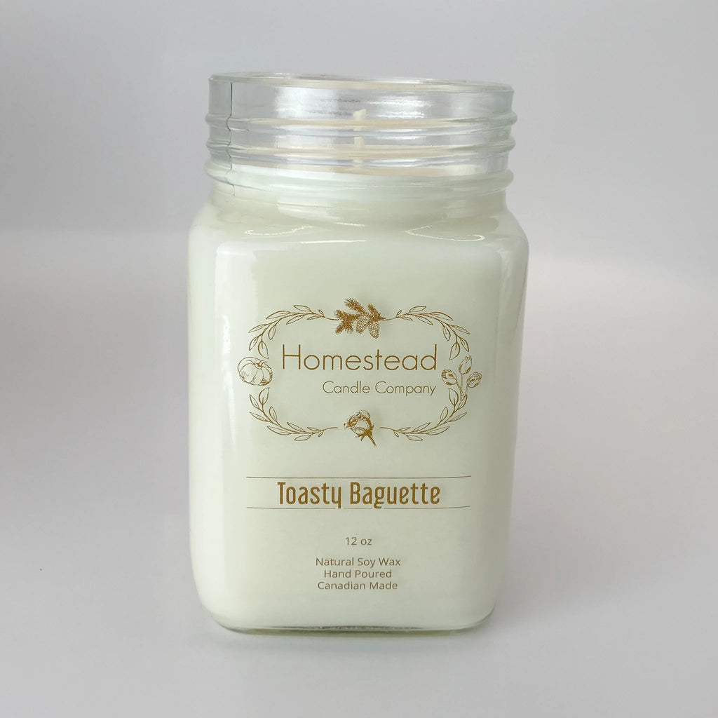 Introducing the Homestead Candle Company's Toasty Baguette, the soy candle in a reusable jar that will make your home smell delicious! Light up this toasty baguette candle and enjoy the warm, comforting scent of freshly baked bread. Perfect for any home and any occasion.