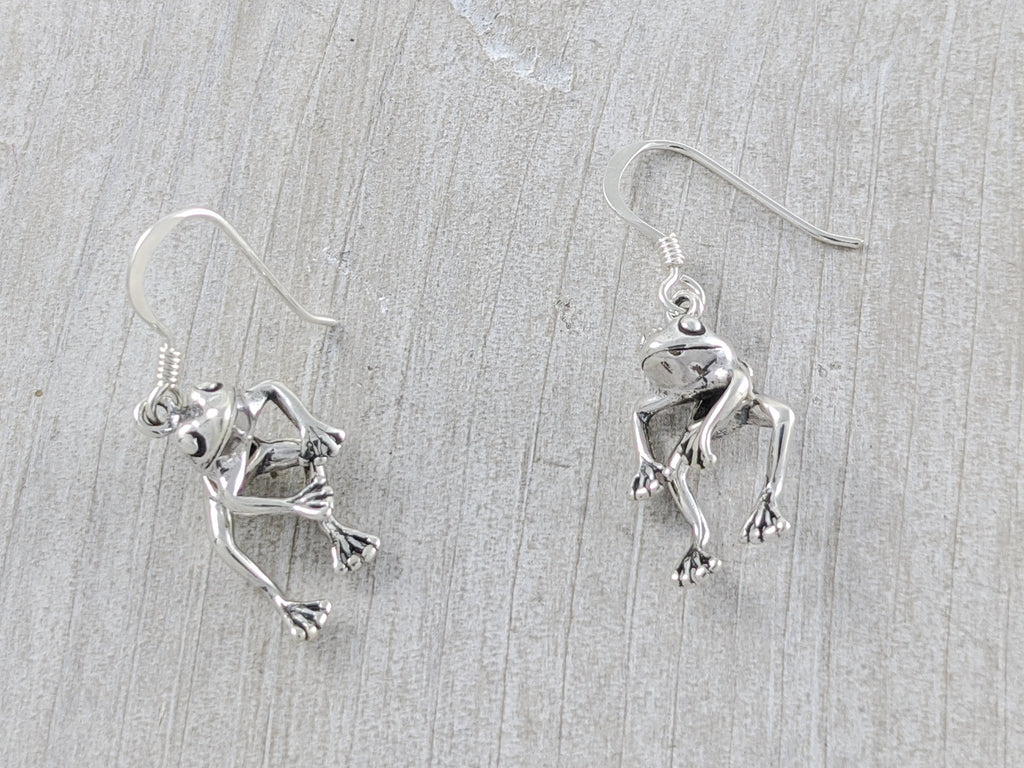 These frogs are jointed at the waist so they move and 'hop' around as they dangle from your ears. Each earring hangs from a Sterling Silver shepherd hook.