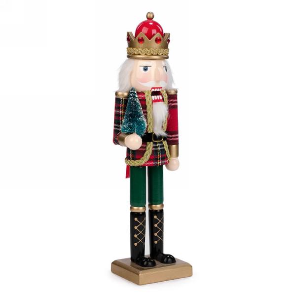Stately nutcracker with plaid coat and jewelled crown. Stands 15” tall.