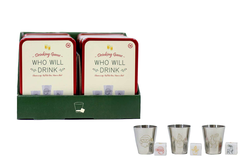 This party game comes in a festive red tin. It includes 3 wooden die and 3 stainless steel shot glasses. Ages 19+
